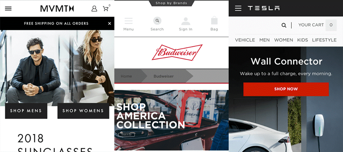 A huge part of menu accessibility is its visibility— it needs to be both clearly delineated from other elements and quickly recognisable as a menu. These days, most mobile websites favor the three-lined ‘hamburger’ icon, and it has become the standard across numerous websites such as Shopify’s template-ready store maker (as used for the example below).