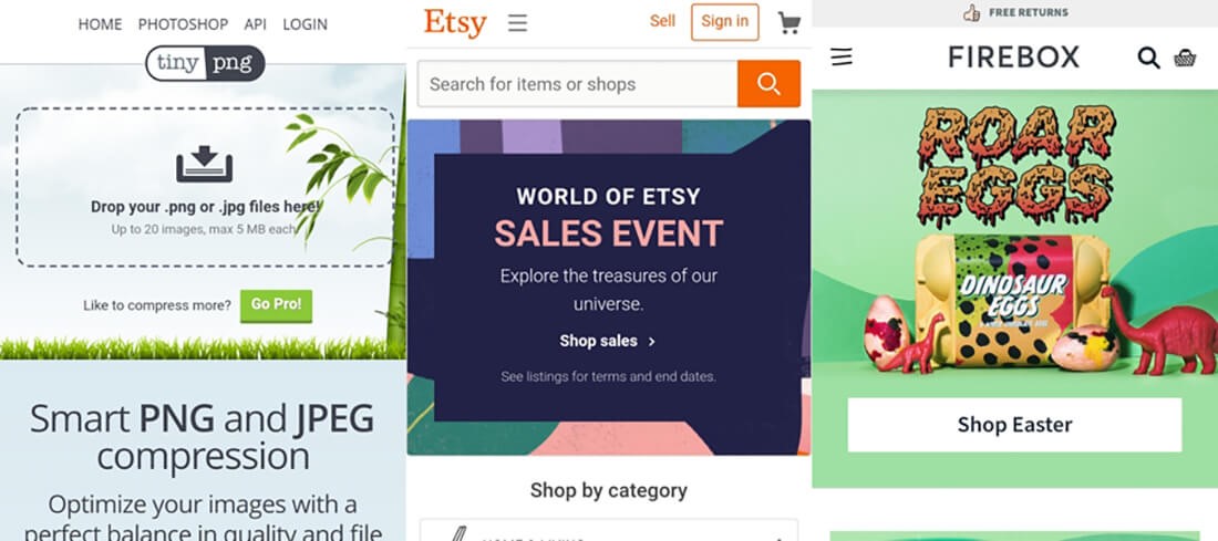 Here are three sites I like a lot, with varying degrees of complexity. TinyPNG does image compression, so it goes right to the drag-and-drop functionality— no need to read a blurb first. Etsy has a simple search bar, a simple sales notice, and a simple category selection, all visible above the fold on my phone. Easy. And Firebox has a terrific hero image and a link to their Easter goods, which is sensibly timely.